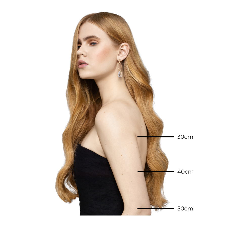 Vårt hår kommer i 3 längder: 30cm, 40cm samt 50cm. Allt vårt hår kommer med extra klipplängd. Se bild nedan.